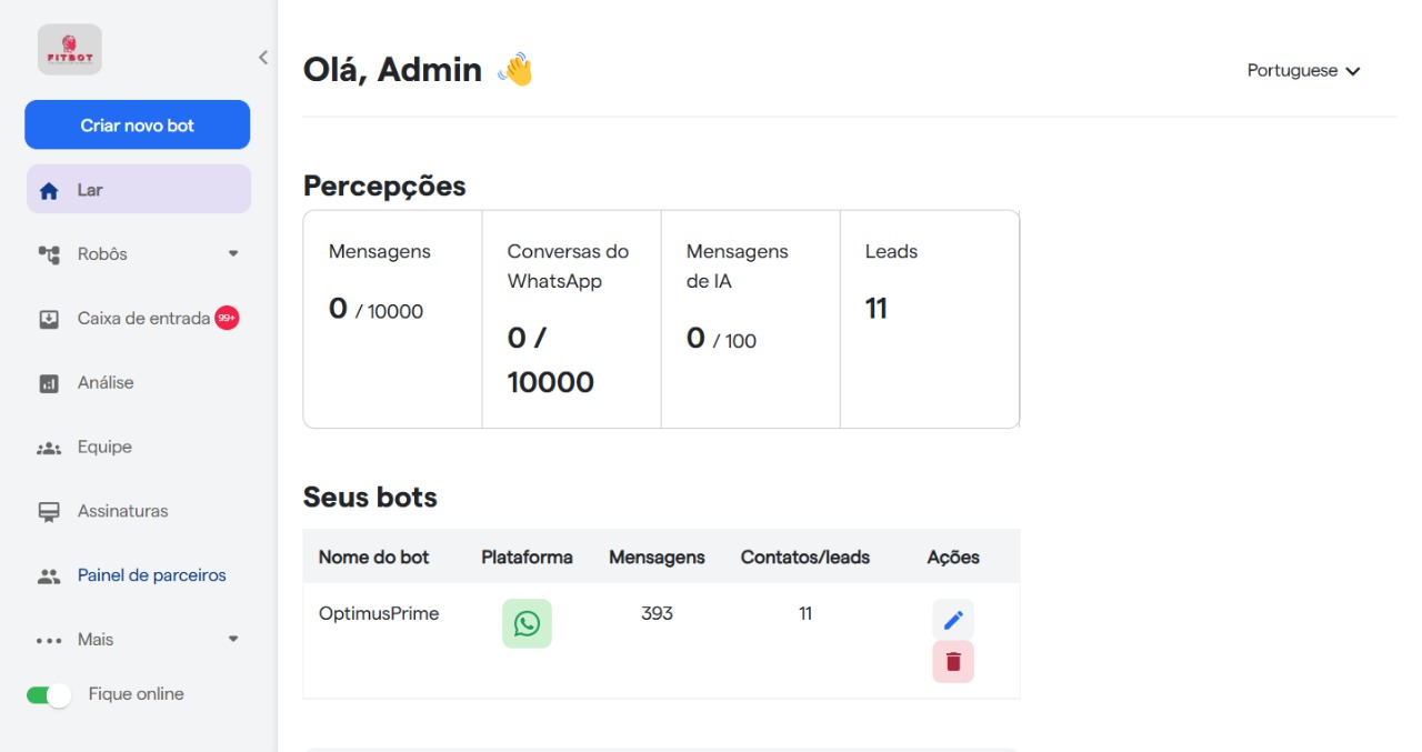Até 1.000 mensagens, 1 chatbot, suporte básico, integração com WhatsApp e Facebook.
